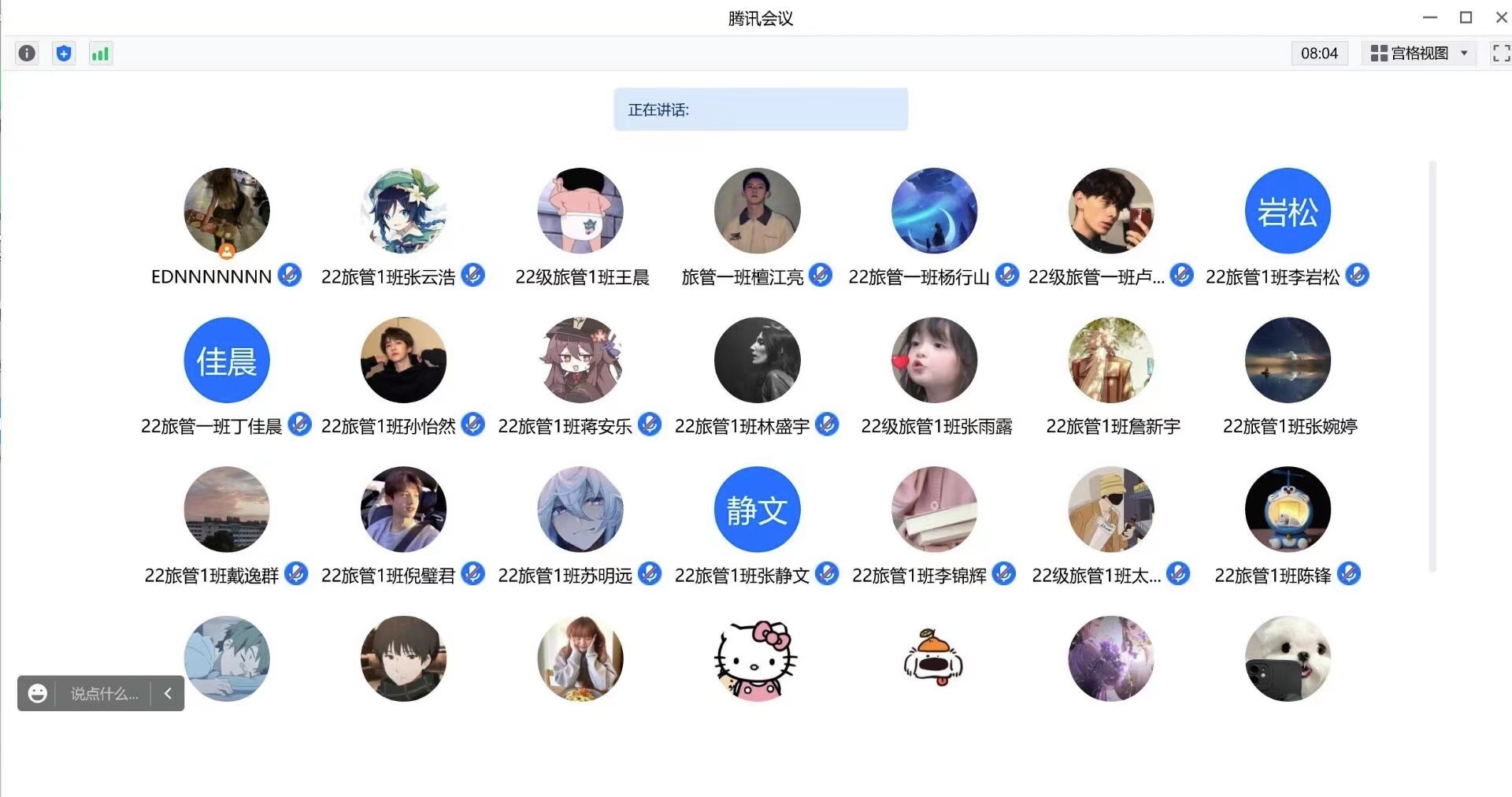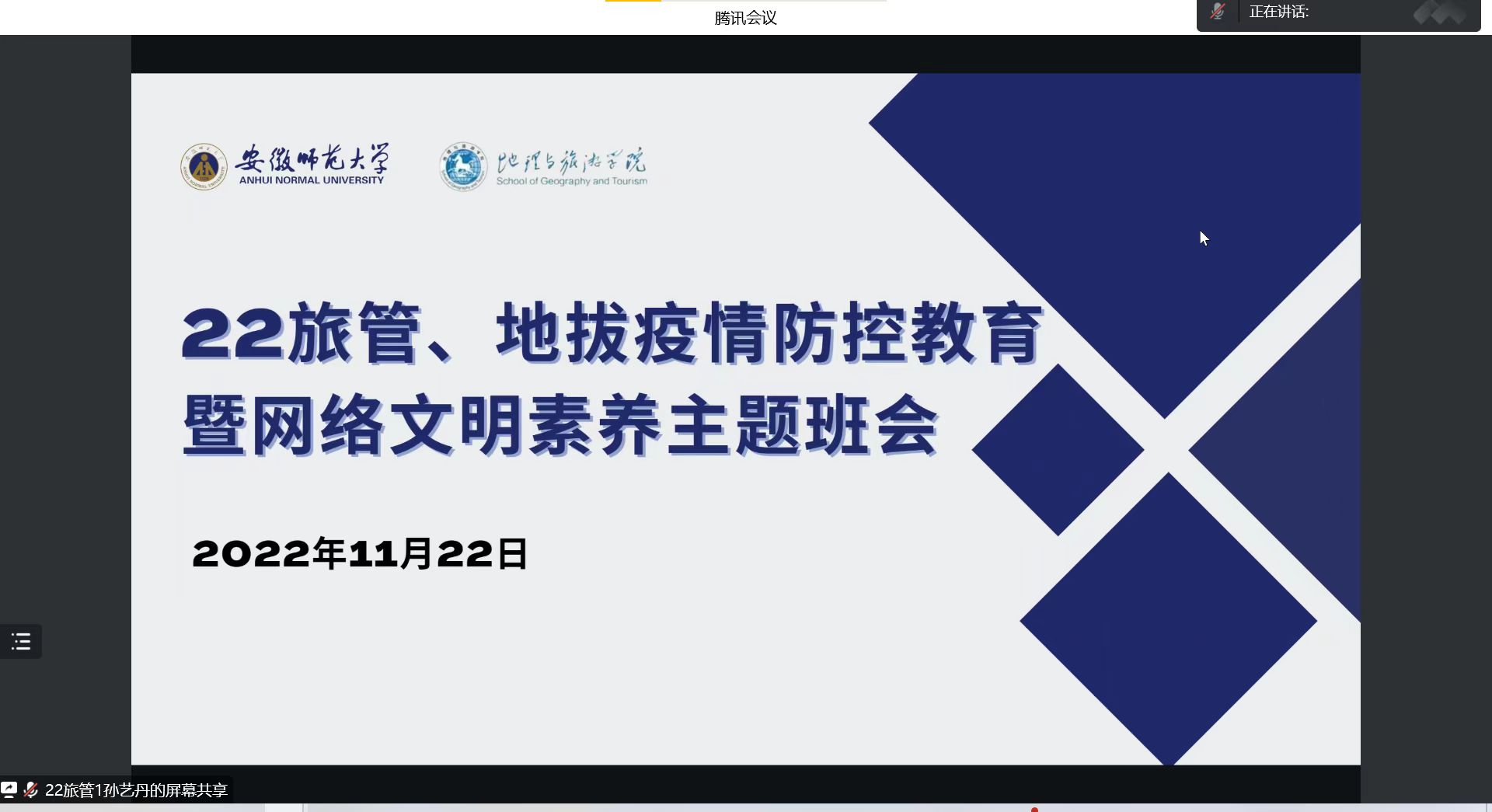 为了做好新冠肺炎疫情防控知识的普及,切实做好疫情防控工作,提升同学们网络文明素养,11月22日中午13:00,2022级旅游管理、地理科学(拔尖班)开展了疫情防控暨网络文明素养教育线上主题班会,会议由辅导员谢园主持,全体员工参会。