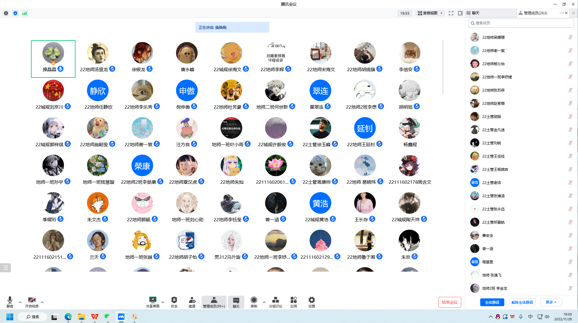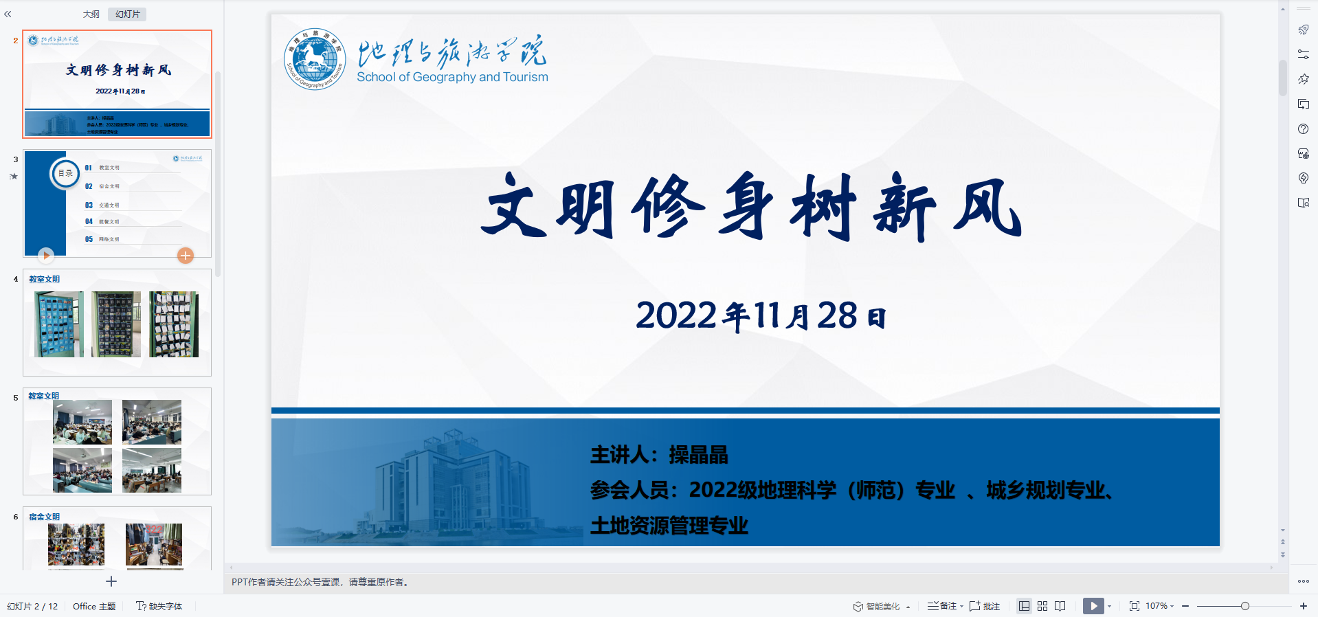 为提高员工文明意识及思想道德修养,加强老员工文明修身教育,2022年11月28日晚,2022级地理科学(师范)专业、土地资源管理专业、城乡规划专业开展“文明修身树新风”线上主题班会,全体员工参会,班会由辅导员操晶晶主持。