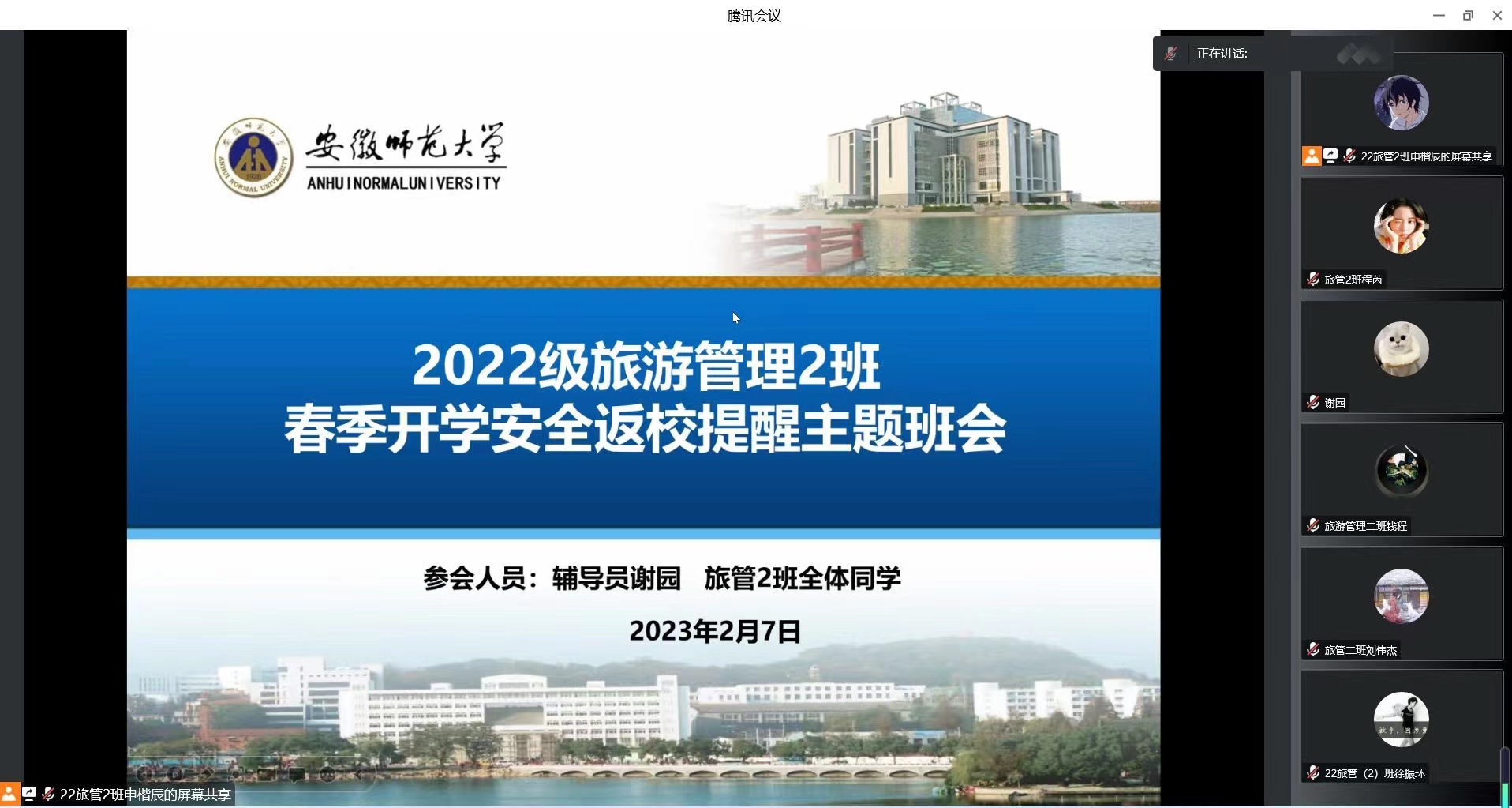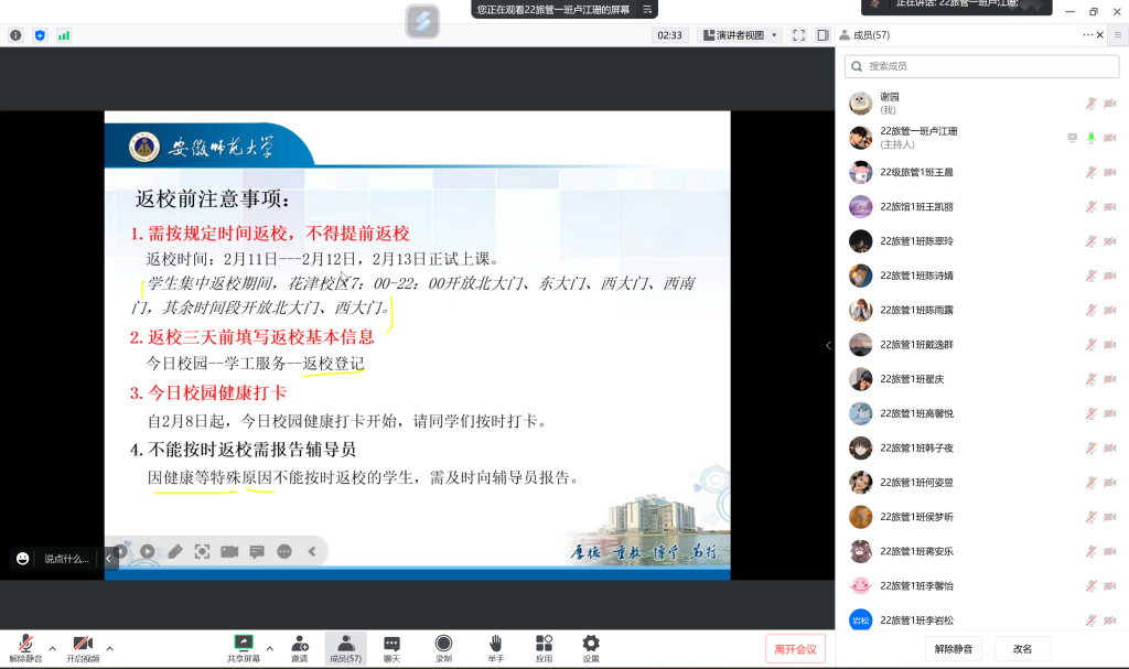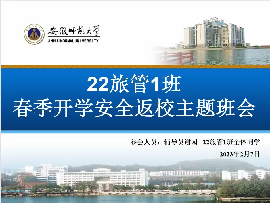 为增强员工安全意识,切实做好春季员工返校的各项工作,帮助员工平安顺利返校,2022级旅游管理1班和2班分别于2月7日下午三点、四点召开春季开学安全返校提醒线上主题班会。本次班会由各班班长卢江珊、申楷辰主持,辅导员谢园老师和22级旅游管理专业全体同学参加。