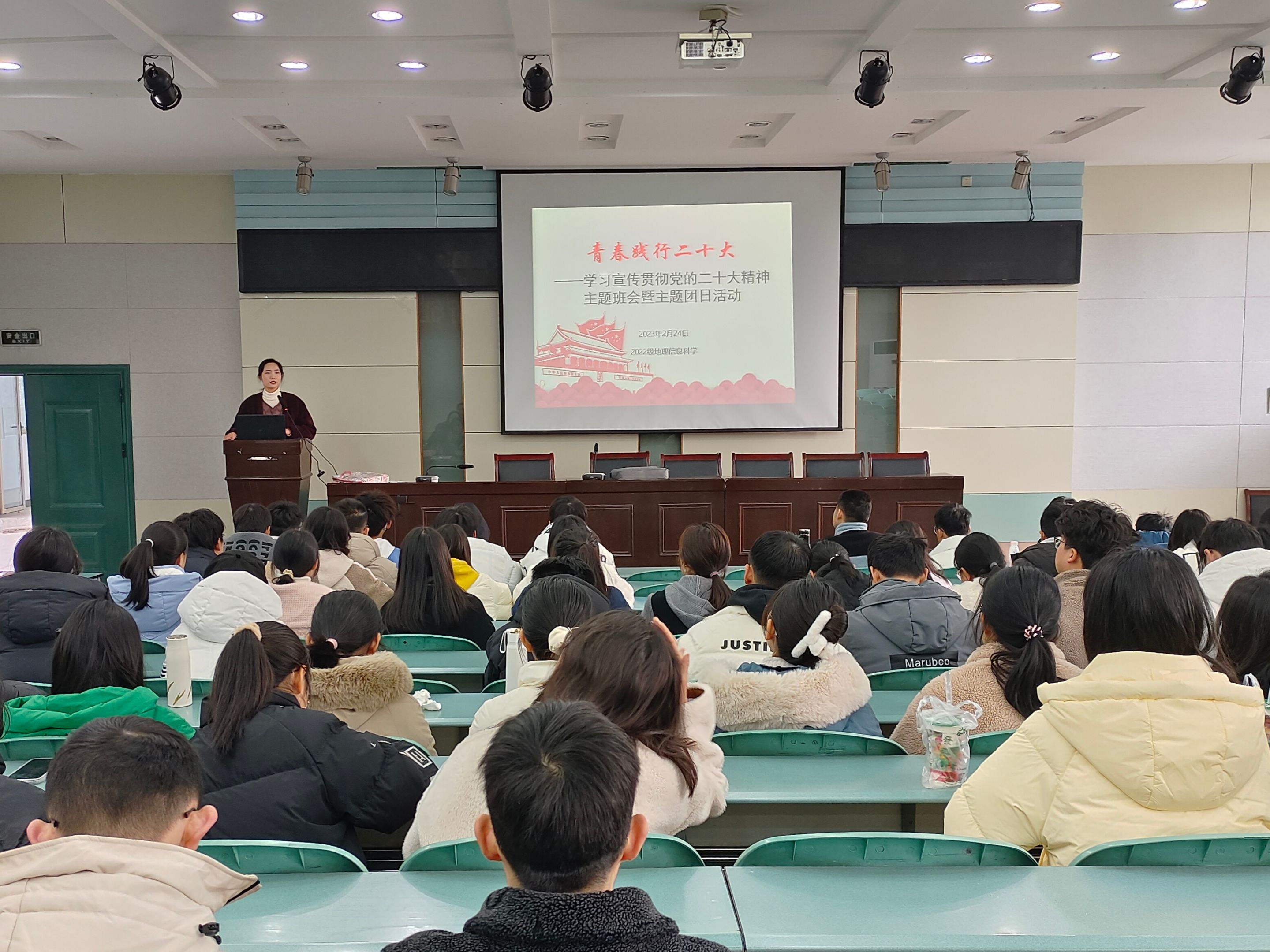 本网讯(魏语菲、陈祥云)2月24日下午,2022级地理信息科学专业一班在实验楼101报告厅开展“青春践行二十大”主题班会暨“我的暖冬故事”寒假社会实践分享会。辅导员陈祥云、2022级地理信息科学一班全体同学参与。