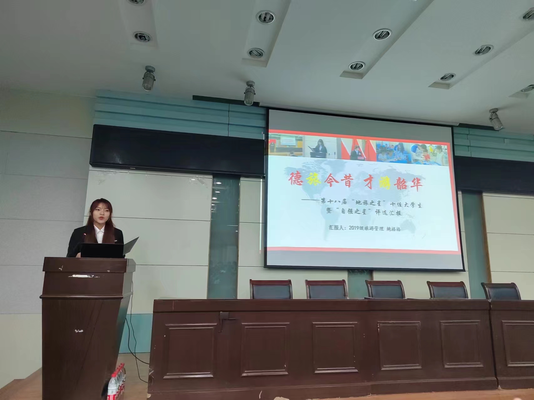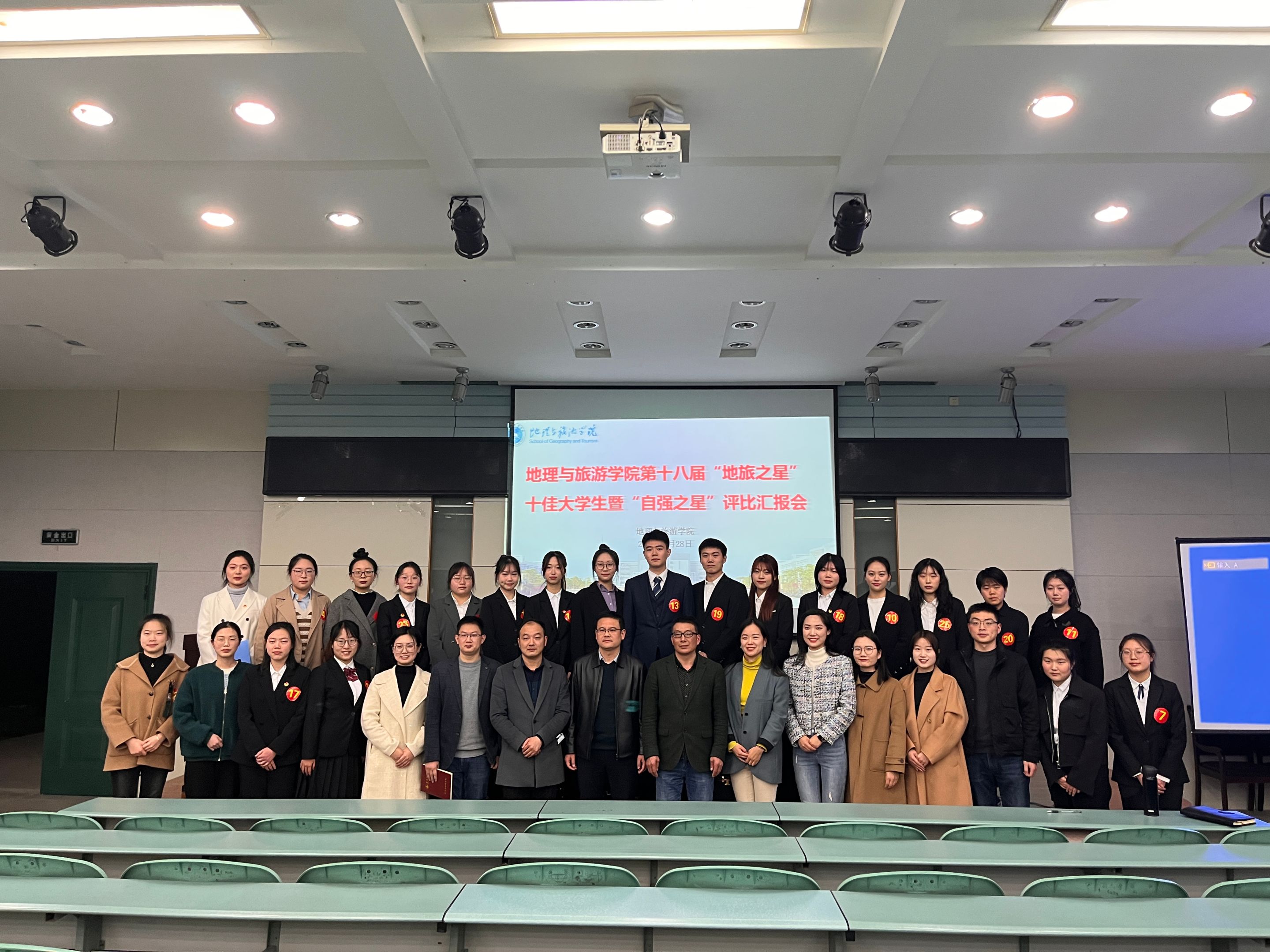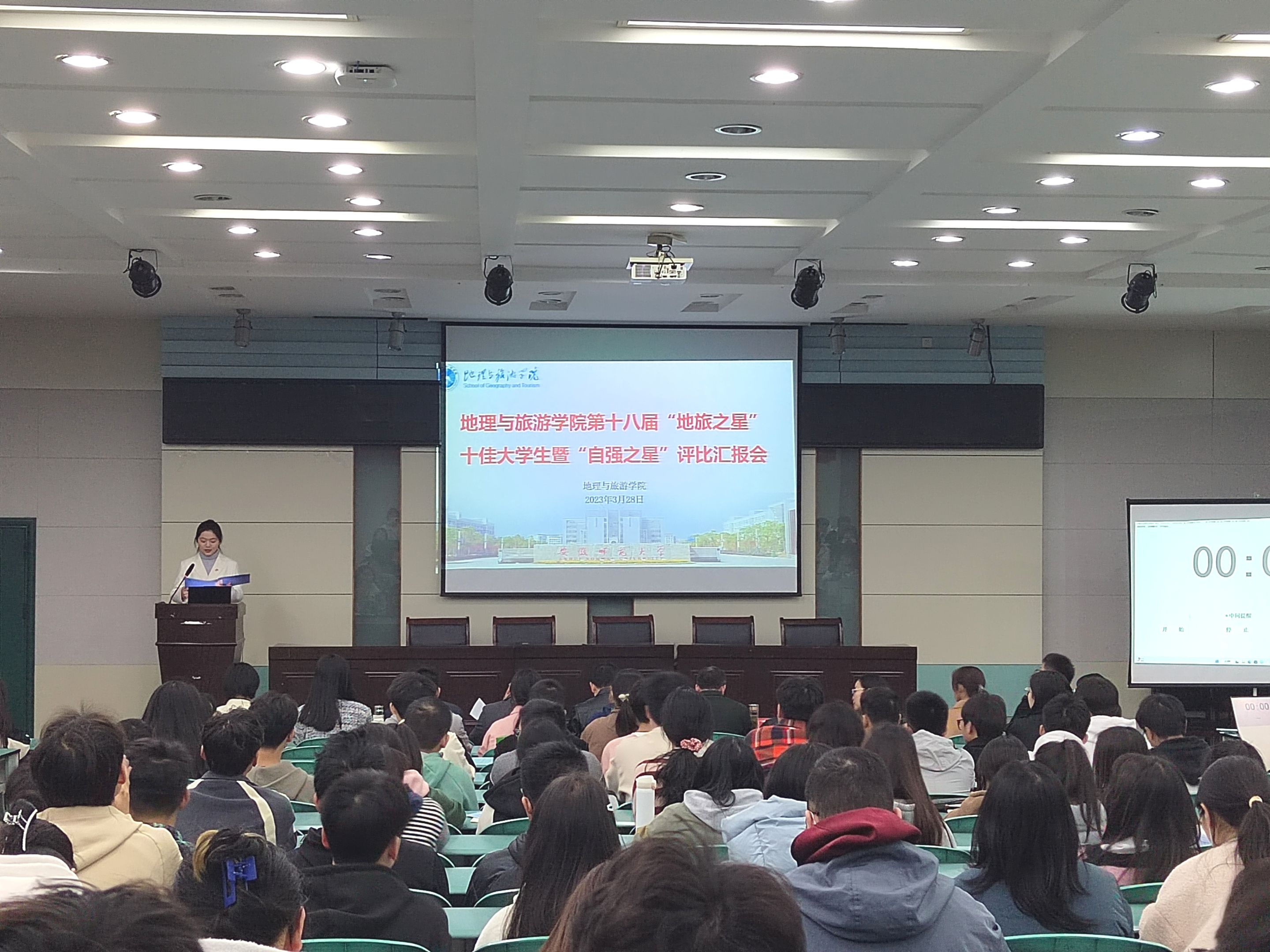 为深入学习宣传贯彻习近平新时代中国特色社会主义思想,全面贯彻落实党的二十大精神,进一步弘扬社会主义核心价值观,充分发挥青年典型模范带头作用, 3月28日晚,地理与旅游学院在实验楼101报告厅举行第十八届“地旅之星”十佳老员工暨“自强之星”评选活动。公司党委副书记付勇,地理科学专业负责人朱永恒,地理信息科学专业负责人宋立生,土地资源管理专业教师梁栋栋,旅游管理专业教师阮陵,城乡规划专业教师姚景艳,以及各专业辅导员老师代表出席活动并担任评委,各班员工代表现场聆听并参与评审。