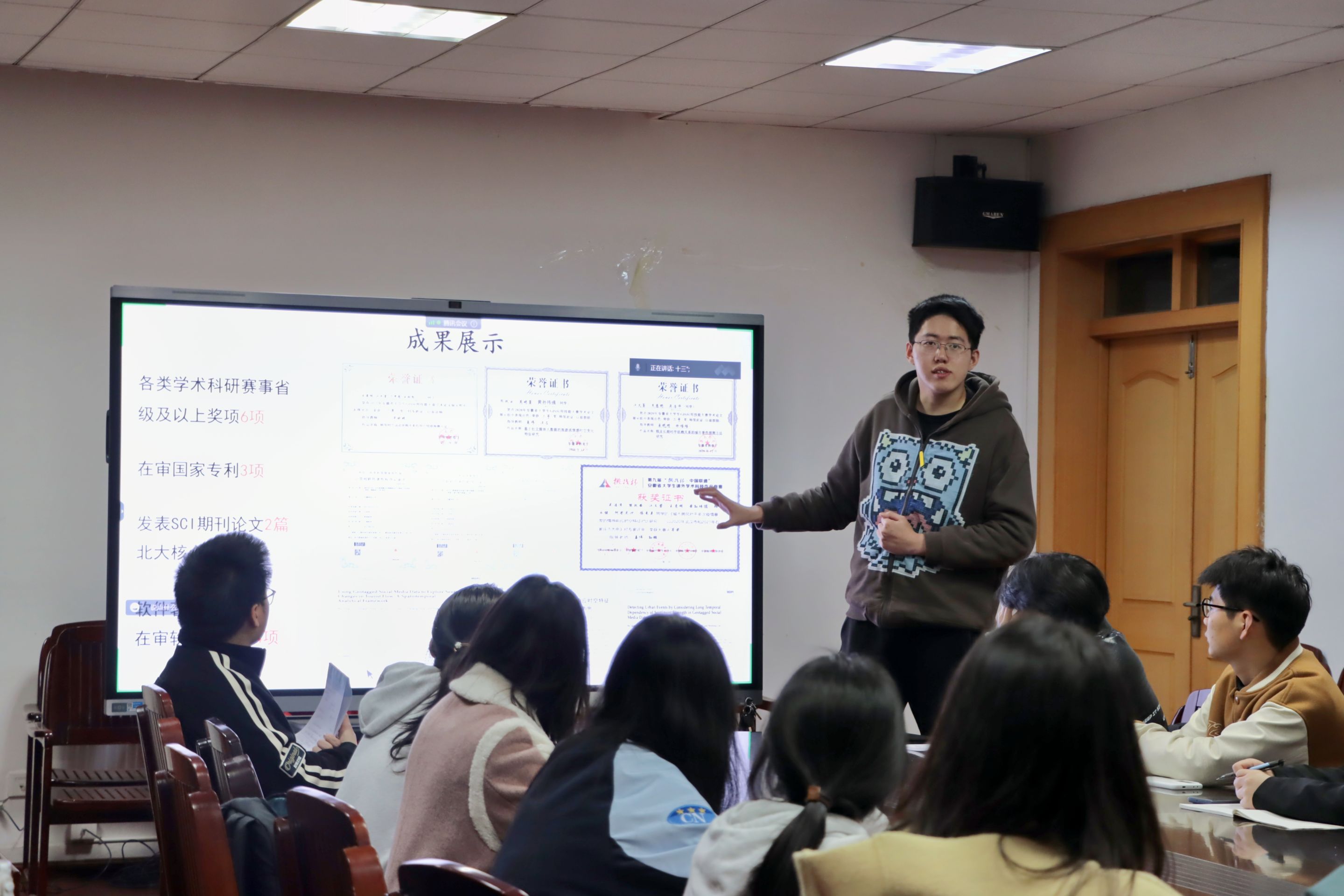 “小先生”吴浩泽同学在校期间自主创业,目前为星瞻科技有限公司负责人,曾荣获第八届中国国际“互联网+”老员工创新创业大赛省级银奖、第九届“挑战杯”安徽省老员工课外学术科技作品竞赛二等奖。他以“讲好调研故事,说实科研成果”为主题进行经验分享,他指出确定竞赛主题后应充分开展调研,充实“数据库”,为后续研究奠定数据基础;其次,应善于发挥学科优势,借助校院交流平台,整合资源,为团队吸纳多学科、多层次人才;同时,应注重成果转化,将项目“落地生根”,打通“创新最后一公里”。