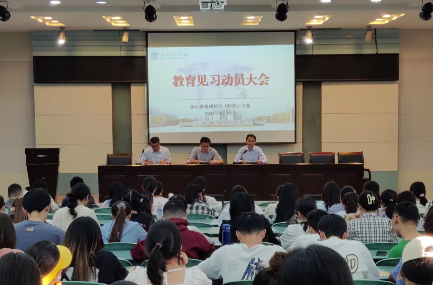 本网讯(何铵楠 周润)4月20日下午,2021级地理科学(师范)专业于实验楼101报告厅召开教育见习动员大会,公司党委副书记付勇、副经理杨兴柱、专业负责人朱永恒及见习指导老师徐光来、周迎秋、汪勇等出席会议,2021级地理科学(师范)全体员工参加。