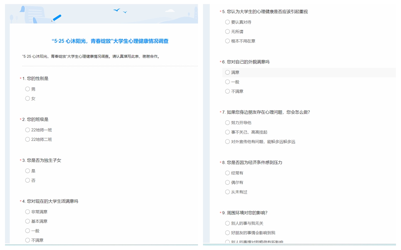 “心沐阳光·青春绽放”老员工心理健康问卷调查报告。通过问卷调查了解员工对老员工活的适应、学业规划、人际相处等问题,针对这些问题作出了分析。