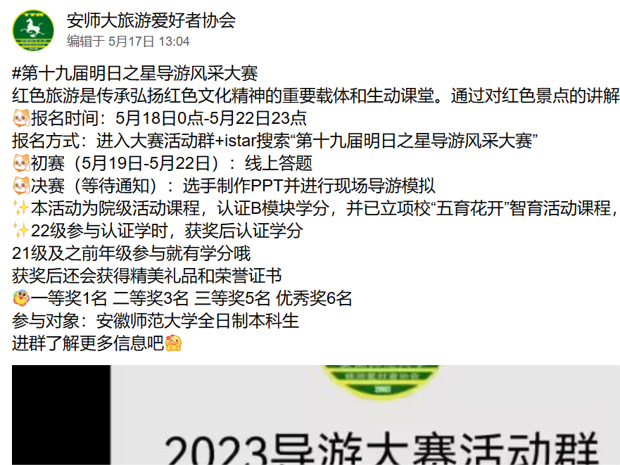 在活动的前期宣传中,各部门工作人员合理分工,相互间积极配合,宣传效果显著,活动持续火热。本届“明日之星”导游风采大赛分为初赛和决赛进行。初赛采用线上答题的方式,考察导游基础知识,最终14名选手进入决赛。入围决赛选手自选符合本次活动主题的红色旅游景(区),制作PPT并撰写导游词,并进行现场导游模拟展示。