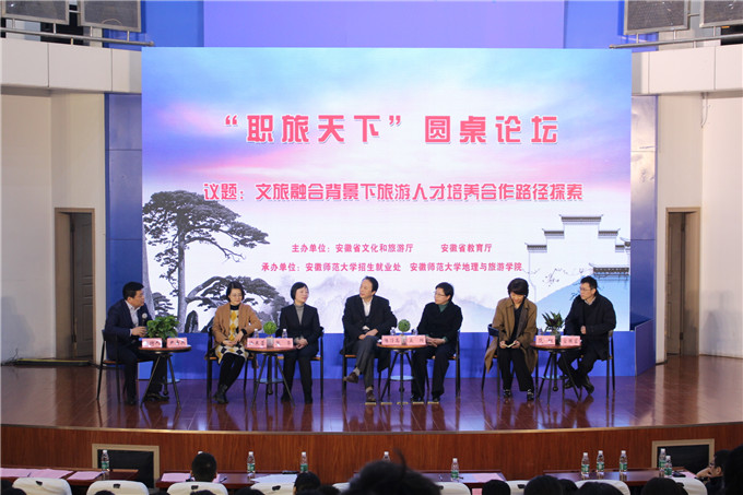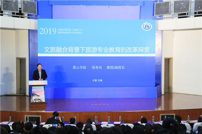 开幕式结束后举行了安徽省第三届旅游业政校企合作高峰论坛暨安徽旅游大讲堂,来自文化和旅游主管部门、旅游院校和企业界的10位专家、高管围绕“文旅融合、人才驱动、创新发展”的活动主题和“文旅融合背景下旅游人才培养合作路径探索”的论坛议题,分别做了“政校企”合作主旨报告和圆桌论坛交流。
