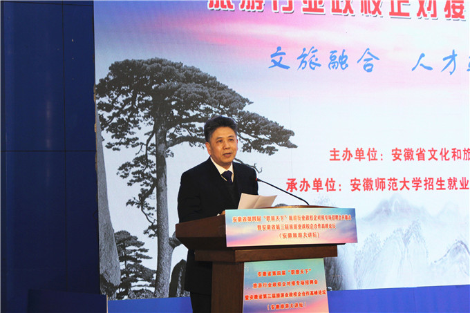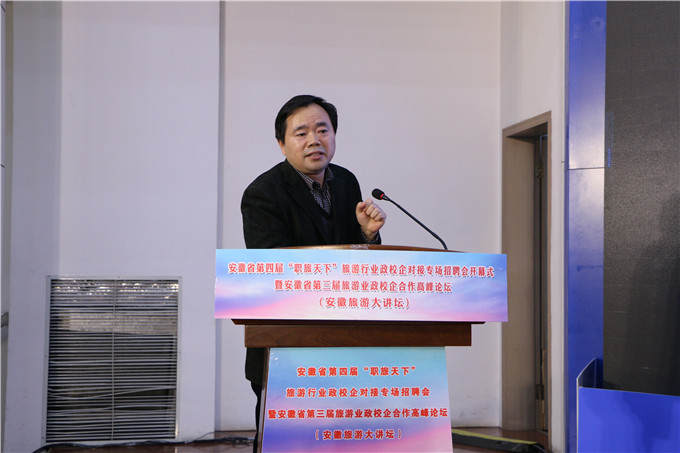 陆林在发言中表示,公司历来高度重视毕业生就业工作,充分肯定了“职旅天下”系列活动的重要意义,认为该项品牌活动已成为一个集“就业招聘+专业建设+行业发展+人才培养”四位一体的协同合作创新平台,希望参会政校企嘉宾朋友依托平台充分交流,共同合作,将行业发展与人才建设相结合,将理论与实践相结合,共同为美好安徽和旅游强省建设发挥重要推动作用。