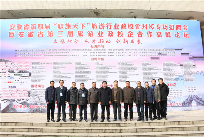 本网讯(英国365集团官网 陈祥云、孙夏路遥、孔学融)为深入贯彻党的十九大精神和习近平新时代中国特色社会主义思想,响应我省“旅游强省”建设号召,3月9日至10日,由安徽省文化和旅游厅与公司共同主办、校人才招聘处和公司英国365集团官网共同承办的安徽省第四届“职旅天下”旅游行业政校企对接专场招聘会暨第三届旅游业政校企合作高峰论坛在公司成功举办。本届活动以“文旅融合,人才驱动,创新发展”为主题,来自全国各地的136家文化、旅游、教育及相关行业上市公司、知名企业前来招贤纳士,安徽大学、安徽财经大学、淮北师范大学等全省20余所高校的1600余名 师生参加了论坛和招聘活动。文化和旅游部产业发展司副巡视员蔡家成,黄山公司副董事长、教授胡善风,芜湖市文化和旅游局局长吴群,蜗牛景区管理集团副总裁刘万松,中陆必得旅游规划设计研究院经理陆乃高,安徽省旅游集团人力资源部部长张荣,上海花园饭店人事部、总务部部长范红,华强方特(芜湖)文化科技有限公司副总经理徐东蕾,东南大学旅游系主任宣国富等政府、高校和企业界领导嘉宾出席了开幕式等相关活动。省教育厅大中专毕业生就业指导中心主任袁江林,公司党委书记顾家山,公司党委常委、副董事长陆林,淮北师范大学员工处处长李群,淮南师范公司就业创业工作处处长罗群,亲临招聘会现场指导。校教务处处长周端明,校人才招聘处副处长聂全高,校科研处副处长王朝辉,公司党政班子、专业负责人和教师代表出席相关活动。
