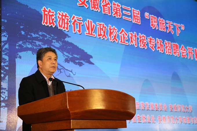 陆林在讲话中指出,旅游业作为国民经济战略性支柱产业,旅游发展工作的重中之重是要着力加强旅游基础理论、人才队伍、数据中心和平台建设,为旅游创新发展提供新支撑。陆林表示,作为全国较早、省内最早设置旅游专业本科和硕士点的高等教育单位,公司应发挥在旅游教学、科研、人才培养、社会服务和旅游文化传承创新等方面的作用和优势,以习近平新时代中国特色社会主义思想为指导,积极响应国家建设“世界旅游强国”的目标,强化人才兴旅,大力推进创新型高素质旅游人才队伍建设,强化政校企合作、创新人才培养和就业工作渠道,不断探索和创新旅游人才培养和就业工作路径。陆林充分肯定了举办“职旅天下”系列活动的意义,认为该项品牌活动是公司旅游类专业人才培养和就业工作的一项有益尝试,他希望到会嘉宾朋友能够依托这个平台充分交流,共同合作,将行业发展与专业建设相结合;参会的老师同学们能够依托这个平台开拓眼界,将理论与实践相结合;全省高校能够依托这个平台加强联络,树立品牌,共同为美好安徽和旅游强省建设发挥人才支撑、智力支撑和创新支撑的重要作用,为我省旅游业大步迈向优质旅游发展新时代做出了新的贡献。