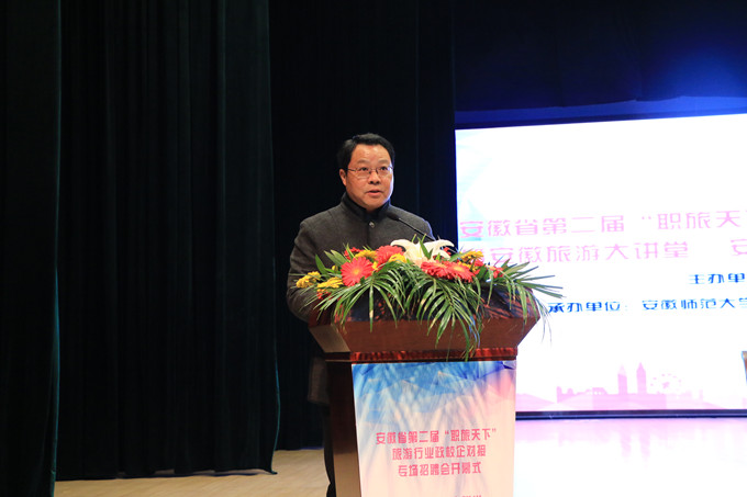 王靖代表安徽省旅游局致辞,她阐述了旅游业在国民经济中的战略性支柱产业地位,并充分肯定了举办该项活动对于我省实施“科教兴旅”、“人才强旅”战略的重要作用。她指出,旅游业作为重要的综合性产业和国民经济战略性支柱产业,其地位作用、辐射带动、发展优势、美好前景愈加凸显,实施“人才强旅”战略对于实现省委省政府提出的“要将旅游业打造成安徽经济社会发展的重要增长极和战略性支柱产业”战略目标显得尤为重要和迫切。王靖表示,“职旅天下”系列活动是联通政府、高校、企业三方的重要平台,为全省旅游就业实践提供了更好、更优、畅通、务实的服务,承载着全省旅游行业对科教兴旅、人才强旅的新期待。她希望与会的专家学者和业界精英能够畅所欲言,共同为安徽旅游人才队伍建设把脉问诊、献计支招;与会的高校充分发挥人才培养、科学研究和社会服务的优势,为“旅游强省”建设贡献人才支撑、智力支撑;参会的企业广纳贤才英才,为旅游发展所用。最后,王靖鼓励广大旅游学子要把握机遇,投身旅游、奋斗旅游、贡献旅游,让旅游为人生添彩!人生因旅游而出彩!