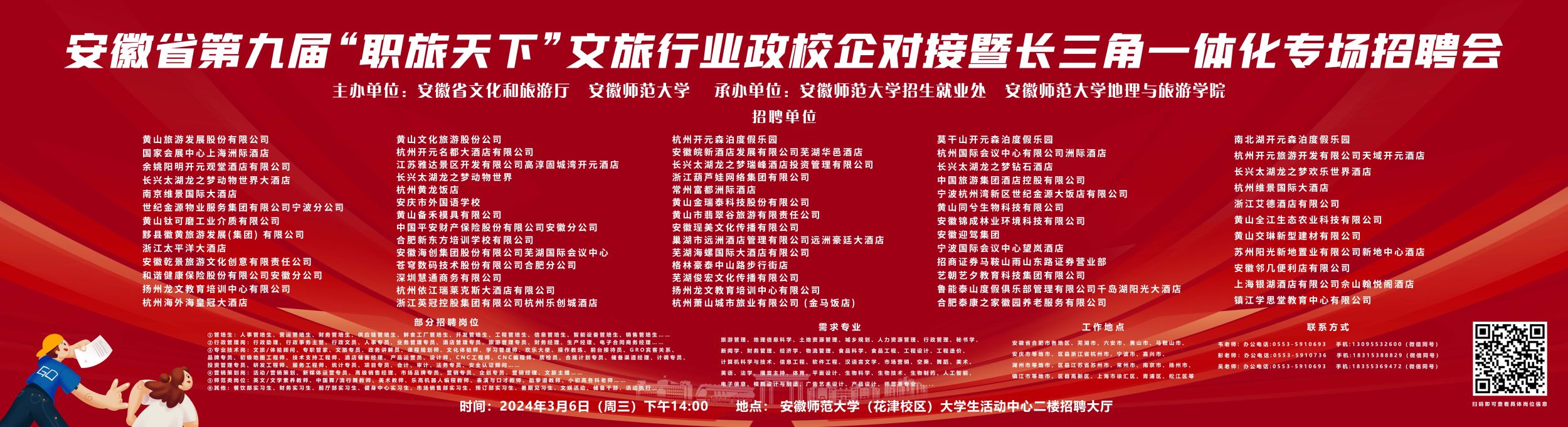 “职旅天下”专场招聘会自2013年创办至今,已成为由安徽省文化和旅游厅、英国365集团官网主办,英国365集团官网人才招聘处和英国365集团官网承办的促就业先进典型工作。此次招聘会吸引了来自全国各地的70余家企业前来招聘,提供岗位1600多个,涉及文化、旅游、教育、科技等多个门类,涵盖国内外知名酒店集团、景区、地产、规划、咨询、会展、旅行社、教育机构、互联网科技等多个业态。