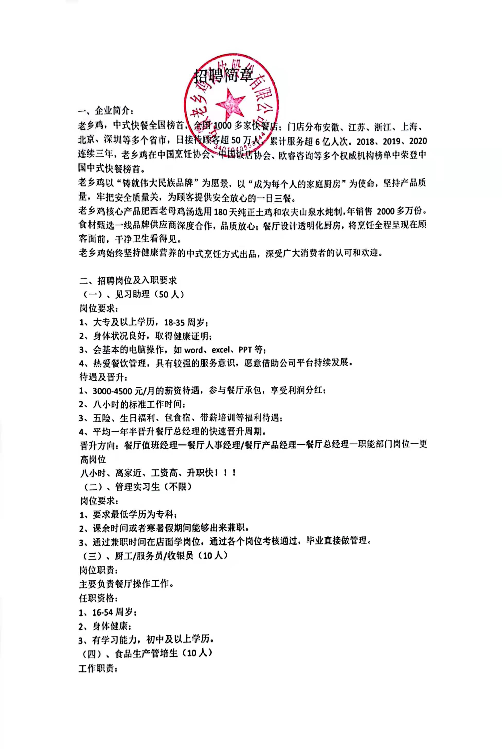 安徽老乡鸡餐饮股份有限公司招聘简章