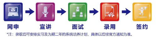 网申校园宣讲—面试—发放录取通知(注:录取后将进行实习安排和为期二年的培养计划,具体以后续通知为准。)